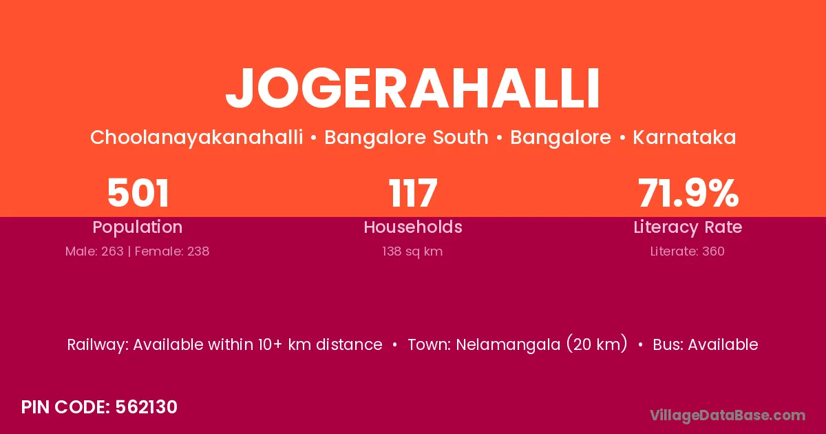 Jogerahalli village has a total population of 501 people, of which 263 are males and 238 are females.