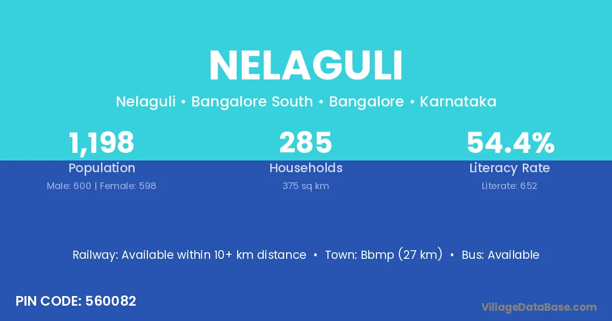 Bbmp (27 km) is the nearest town to Nelaguli village for major economic activities and is located approximately 27 km away.