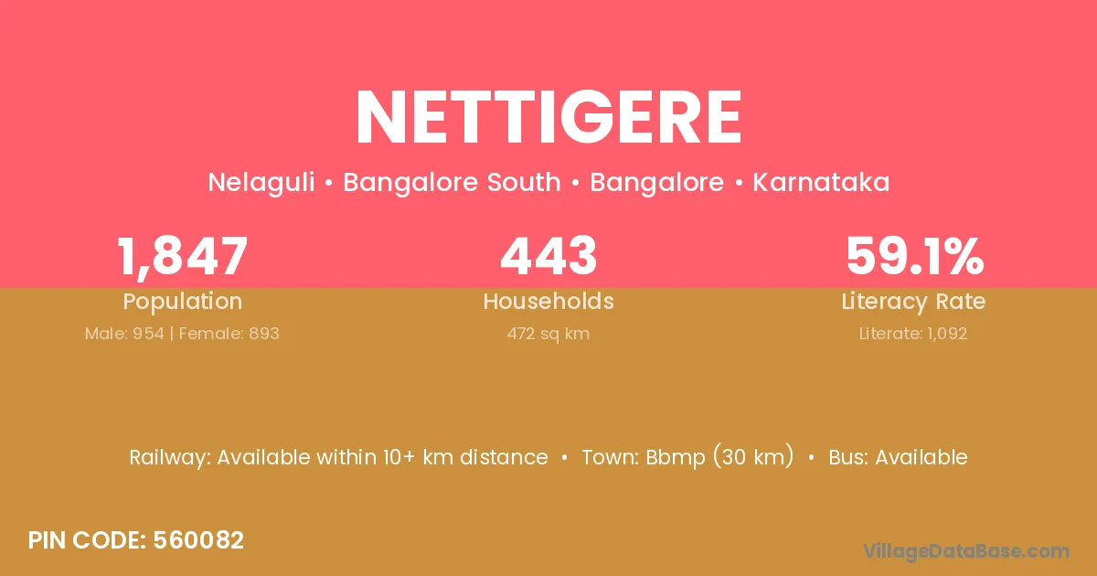 Bbmp (30 km) is the nearest town to Nettigere village for major economic activities and is located approximately 30 km away.