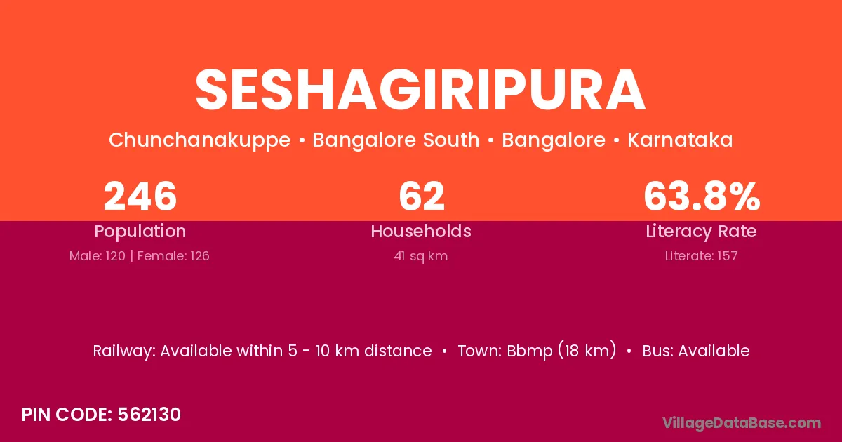 Bbmp (18 km) is the nearest town to Seshagiripura village for major economic activities and is located approximately 18 km away.