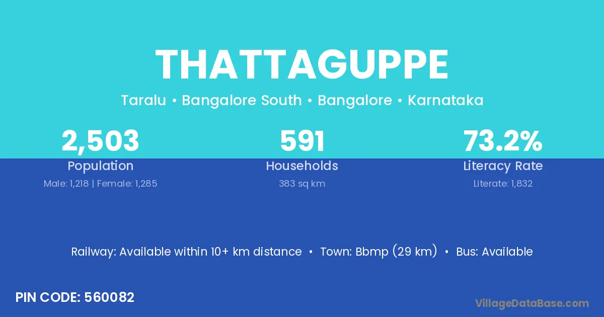 Thattaguppe village has a total population of 2,503 people, of which 1,218 are males and 1,285 are females.