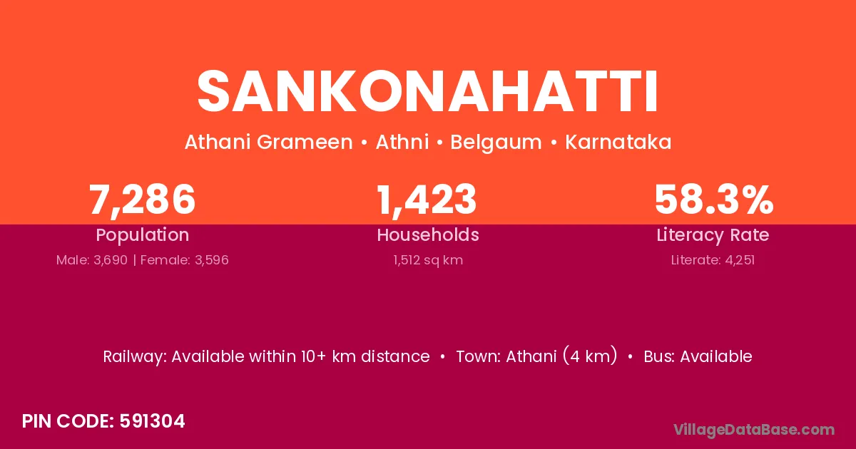 Athani (4 km) is the nearest town to Sankonahatti village for major economic activities and is located approximately 4 km away.