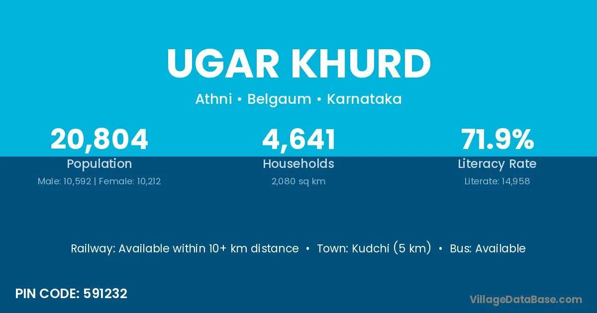 Ugar Khurd village has a total population of 20,804 people, of which 10,592 are males and 10,212 are females.