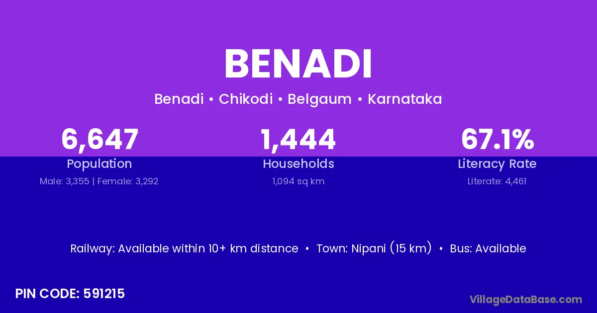 Nipani (15 km) is the nearest town to Benadi village for major economic activities and is located approximately 15 km away.