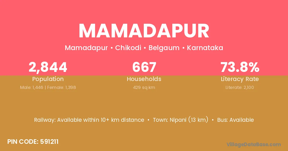 Nipani (13 km) is the nearest town to Mamadapur village for major economic activities and is located approximately 13 km away.