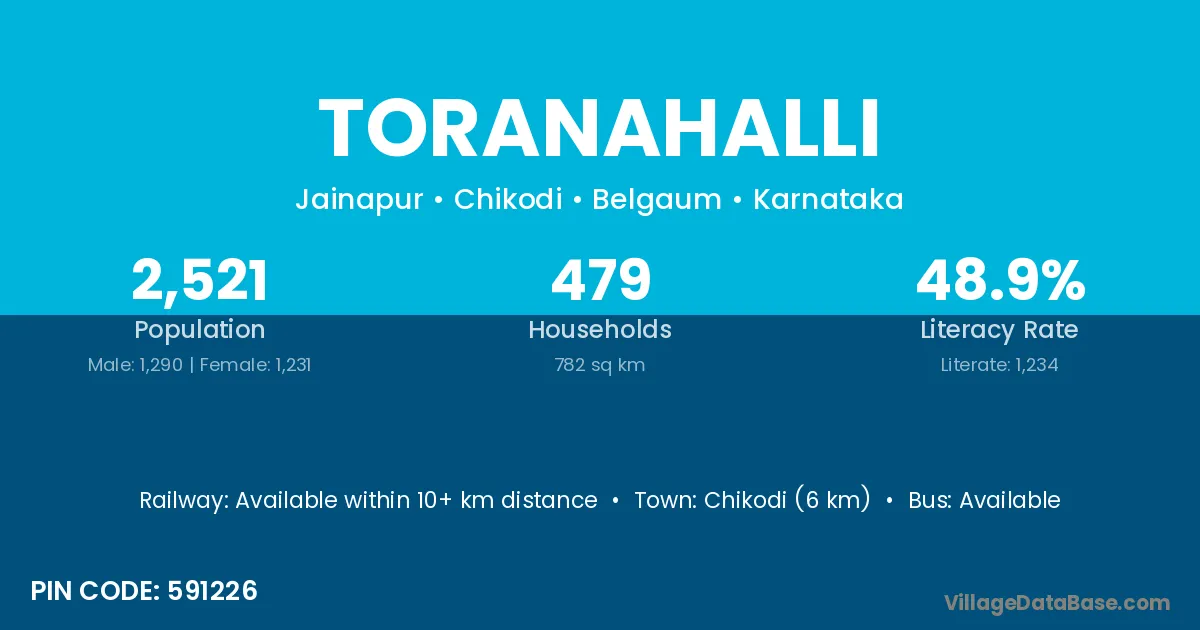 Chikodi (6 km) is the nearest town to Toranahalli village for major economic activities and is located approximately 6 km away.