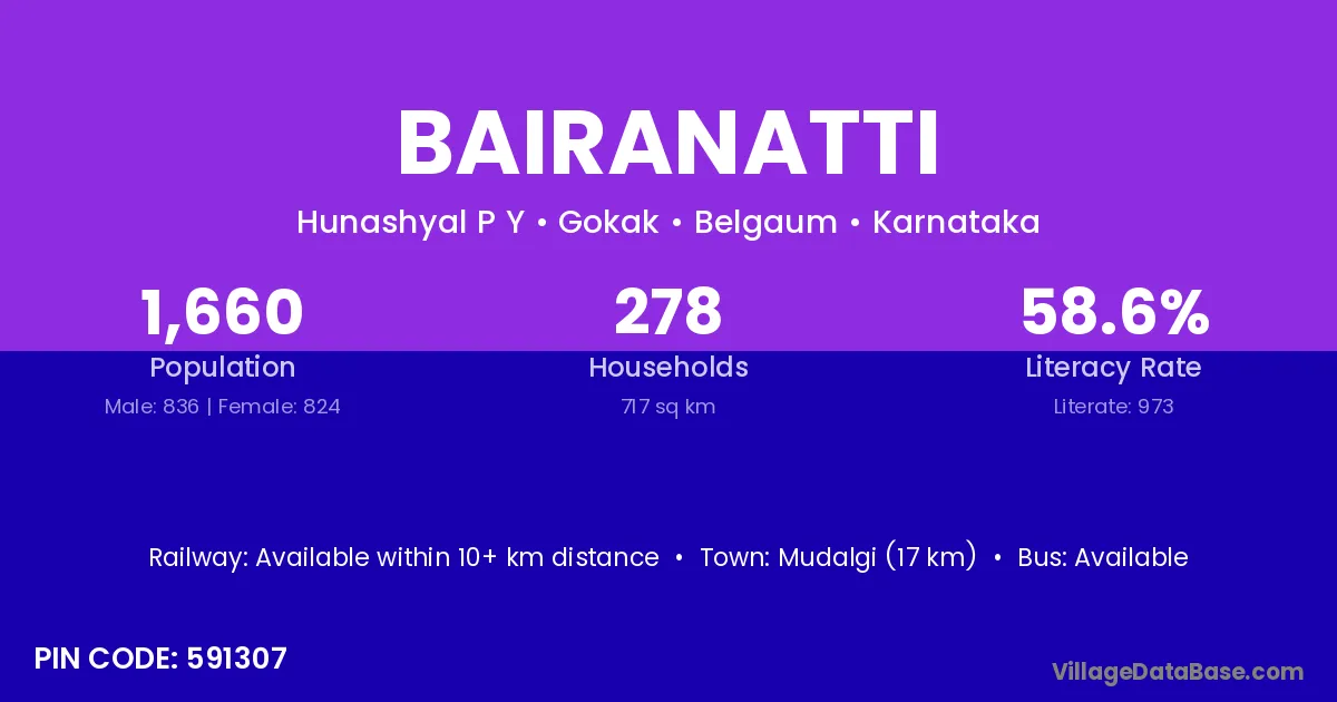 Mudalgi (17 km) is the nearest town to Bairanatti village for major economic activities and is located approximately 17 km away.