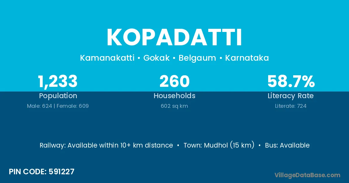 Mudhol (15 km) is the nearest town to Kopadatti village for major economic activities and is located approximately 15 km away.