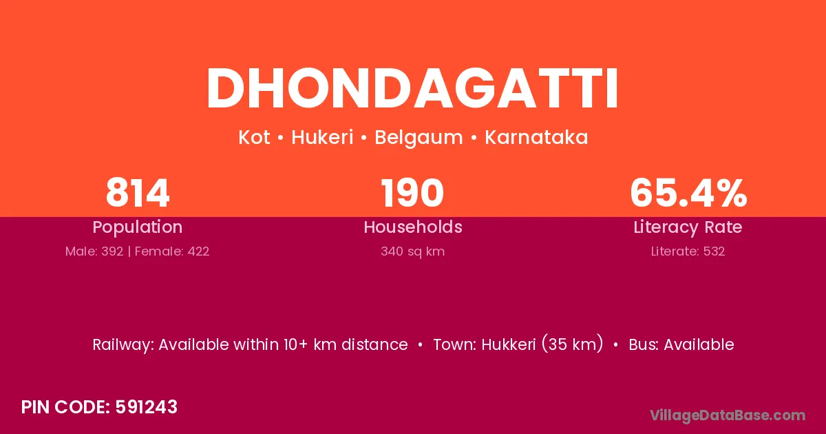 Dhondagatti village has a total population of 814 people, of which 392 are males and 422 are females.