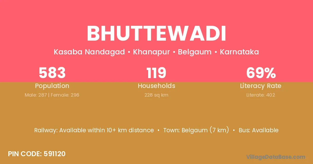 Belgaum (7 km) is the nearest town to Bhuttewadi village for major economic activities and is located approximately 7 km away.