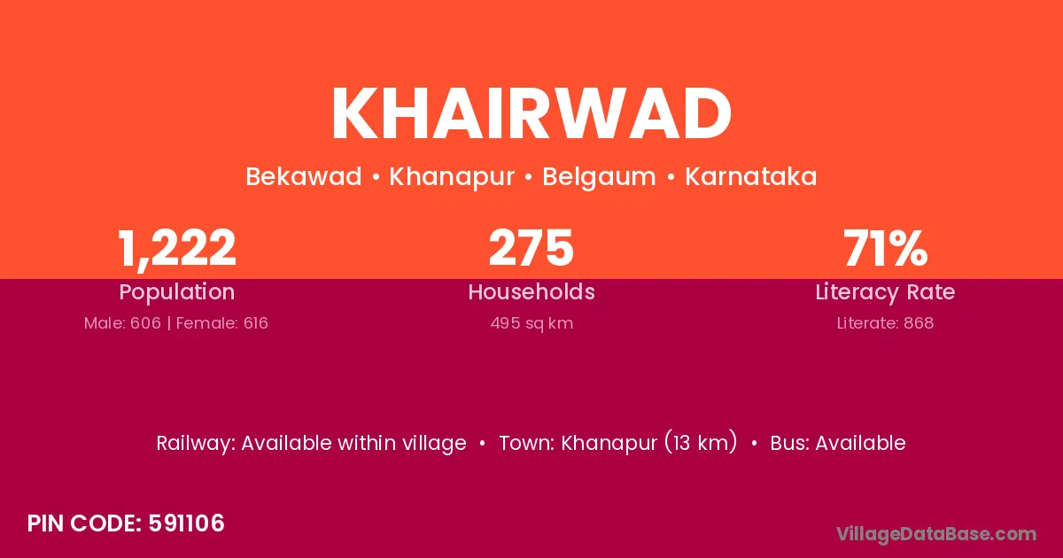 Khairwad village has a total population of 1,222 people, of which 606 are males and 616 are females.