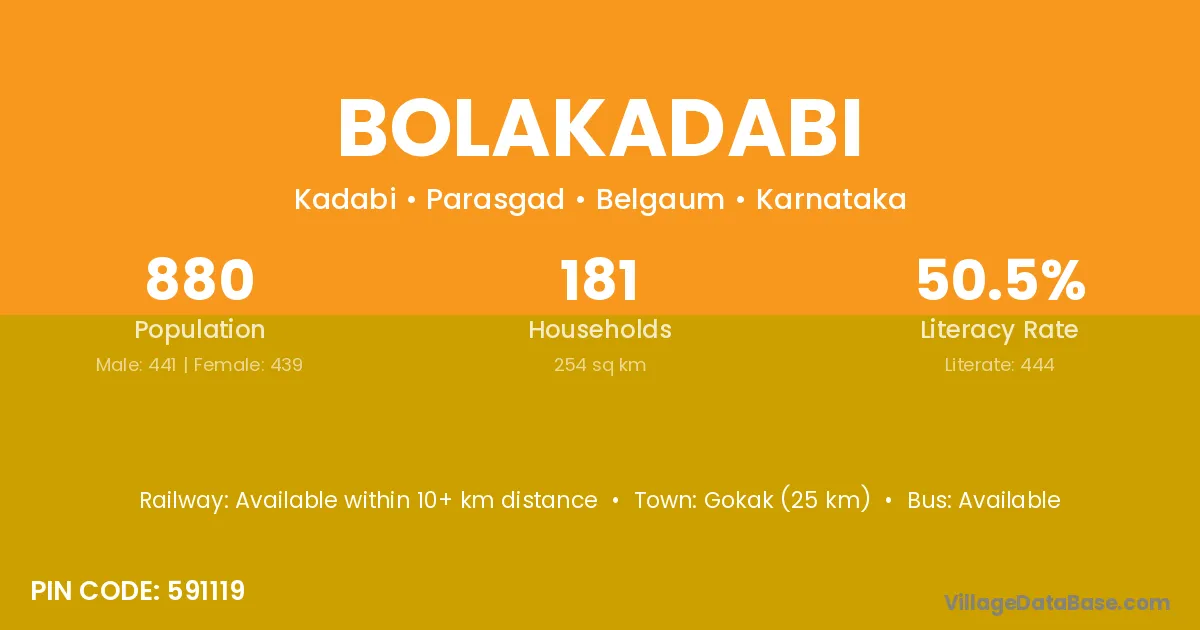 Gokak (25 km) is the nearest town to Bolakadabi village for major economic activities and is located approximately 25 km away.