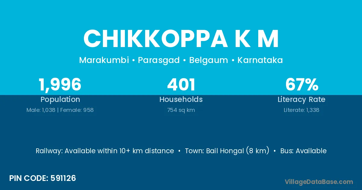 Bail Hongal (8 km) is the nearest town to Chikkoppa K M village for major economic activities and is located approximately 8 km away.