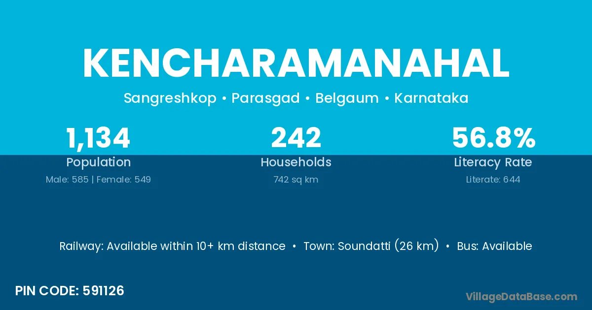 Kencharamanahal village has a total population of 1,134 people, of which 585 are males and 549 are females.