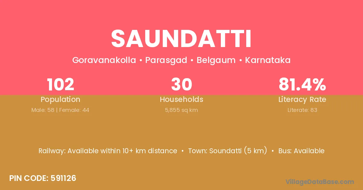 Soundatti (5 km) is the nearest town to Saundatti village for major economic activities and is located approximately 5 km away.