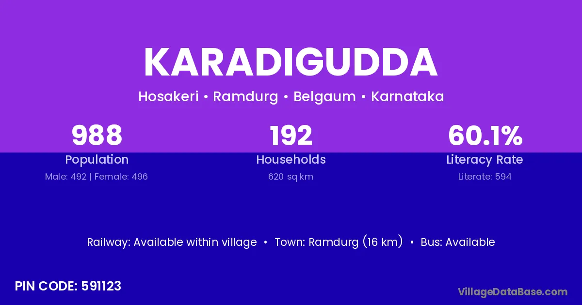 Karadigudda village has a total population of 988 people, of which 492 are males and 496 are females.