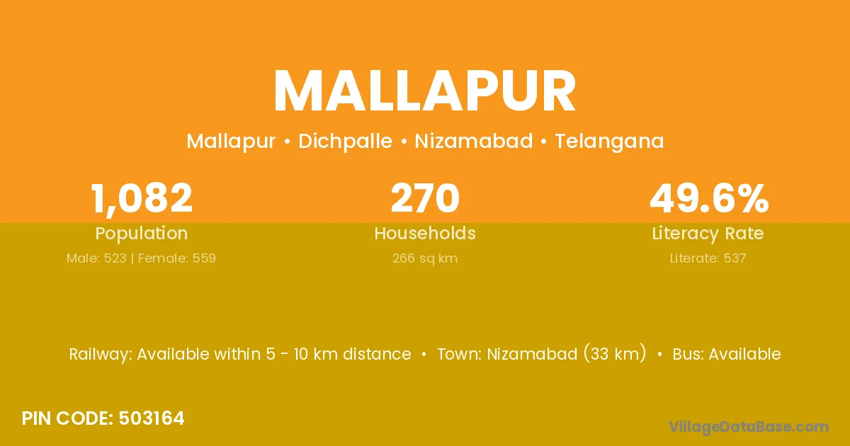 The literacy rate of Mallapur village is 45.73%. Male literacy stands at 53.51% and female literacy at 37.77%.