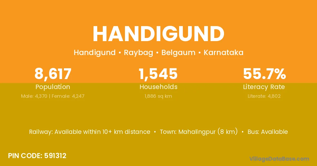 Mahalingpur (8 km) is the nearest town to Handigund village for major economic activities and is located approximately 8 km away.