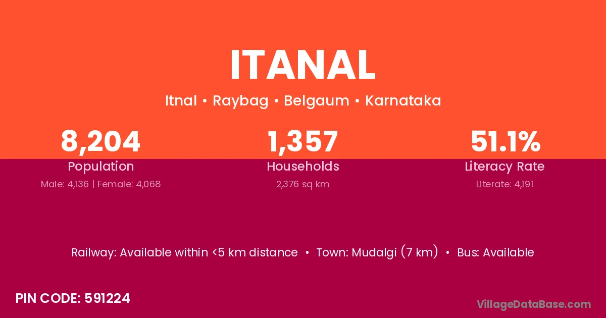 Mudalgi (7 km) is the nearest town to Itanal village for major economic activities and is located approximately 7 km away.