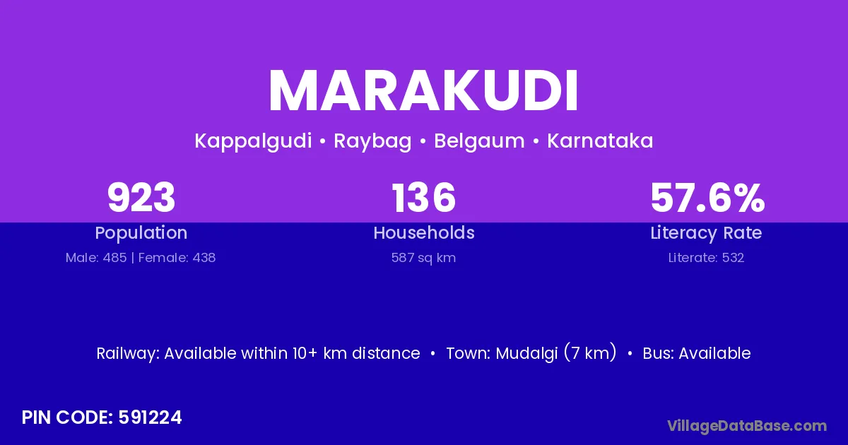 Mudalgi (7 km) is the nearest town to Marakudi village for major economic activities and is located approximately 7 km away.