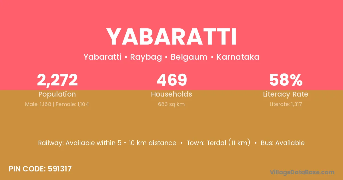 Yabaratti village has a total population of 2,272 people, of which 1,168 are males and 1,104 are females.