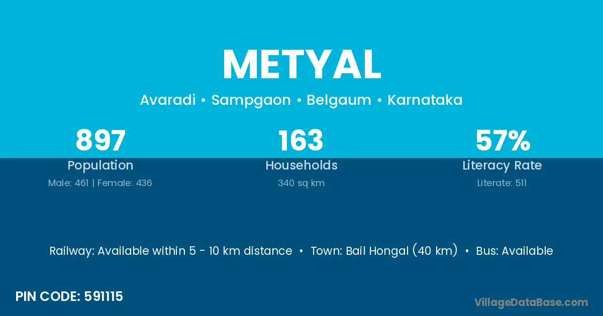 Bail Hongal (40 km) is the nearest town to Metyal village for major economic activities and is located approximately 40 km away.
