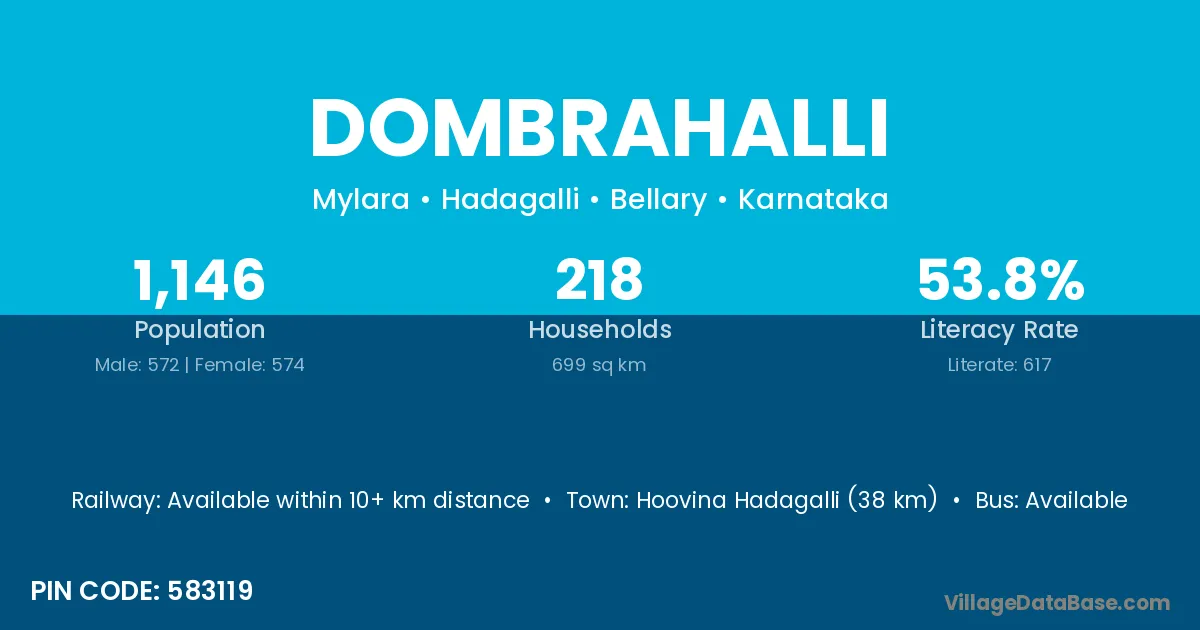 Hoovina Hadagalli (38 km) is the nearest town to Dombrahalli village for major economic activities and is located approximately 38 km away.