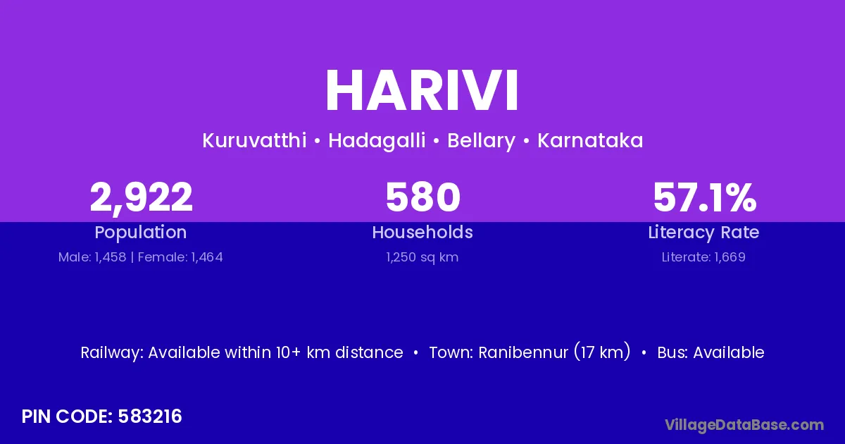 Ranibennur (17 km) is the nearest town to Harivi village for major economic activities and is located approximately 17 km away.