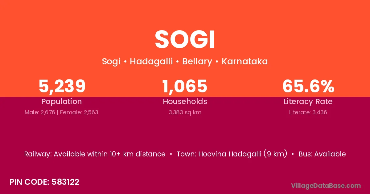 Hoovina Hadagalli (9 km) is the nearest town to Sogi village for major economic activities and is located approximately 9 km away.