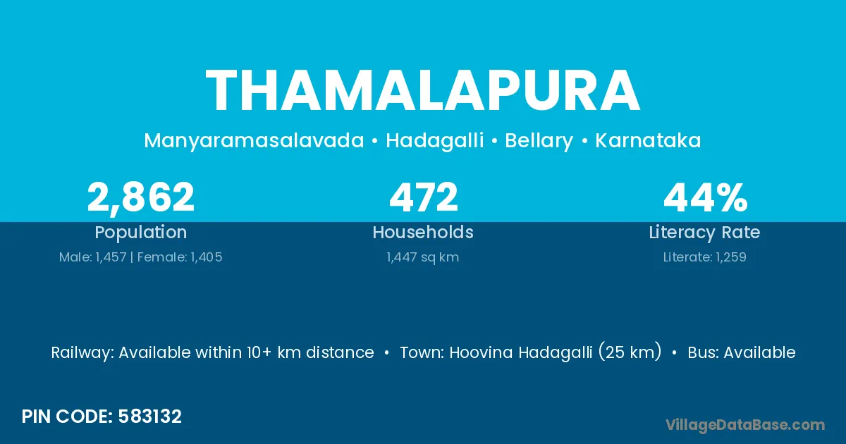 Hoovina Hadagalli (25 km) is the nearest town to Thamalapura village for major economic activities and is located approximately 25 km away.