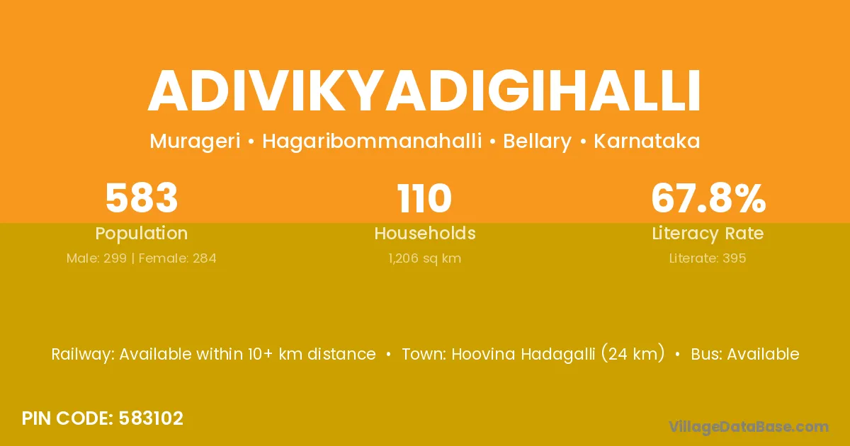 Hoovina Hadagalli (24 km) is the nearest town to Adivikyadigihalli village for major economic activities and is located approximately 24 km away.