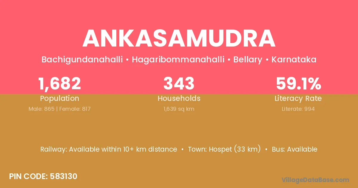 Hospet (33 km) is the nearest town to Ankasamudra village for major economic activities and is located approximately 33 km away.