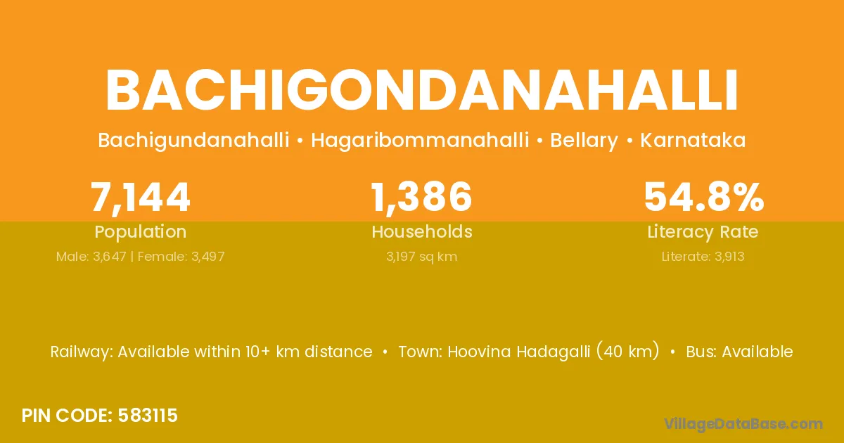 Bachigondanahalli village has a total population of 7,144 people, of which 3,647 are males and 3,497 are females.