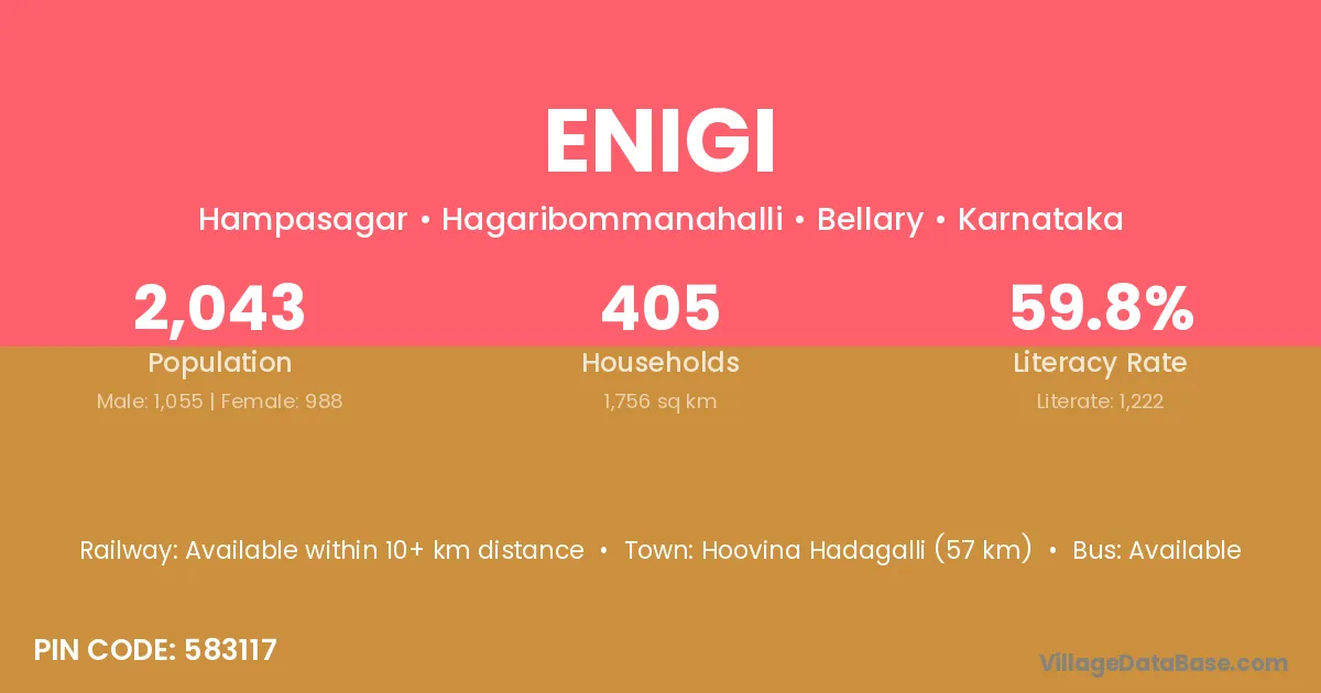 Hoovina Hadagalli (57 km) is the nearest town to Enigi village for major economic activities and is located approximately 57 km away.
