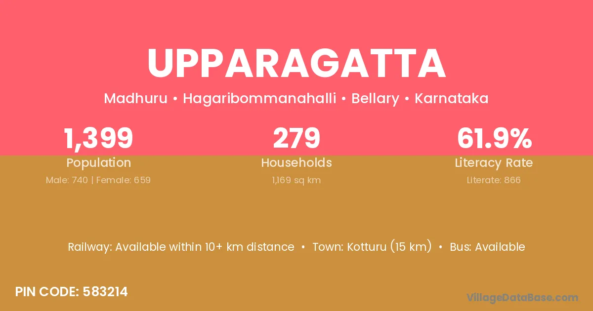 Upparagatta village has a total population of 1,399 people, of which 740 are males and 659 are females.