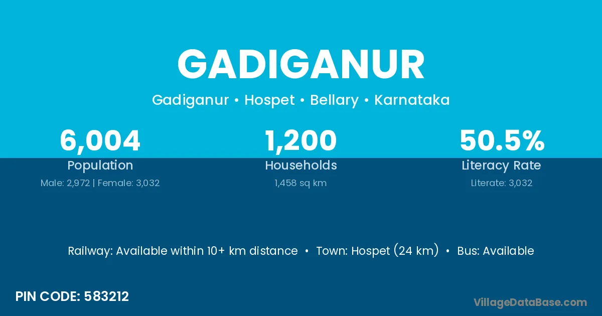 Hospet (24 km) is the nearest town to Gadiganur village for major economic activities and is located approximately 24 km away.