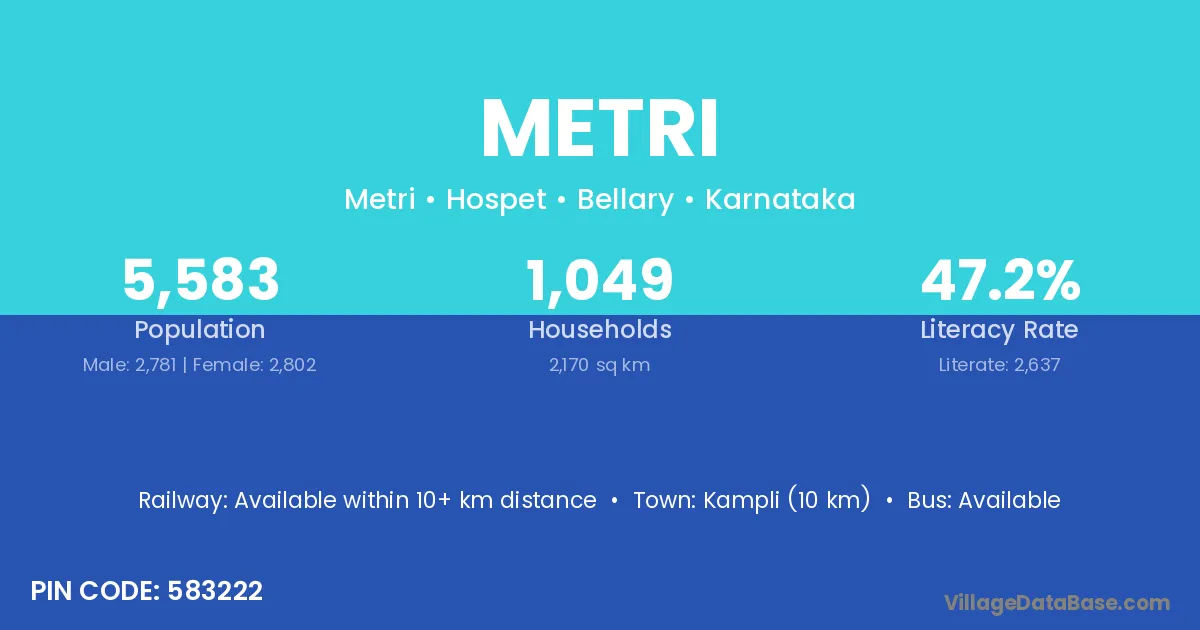 Kampli (10 km) is the nearest town to Metri village for major economic activities and is located approximately 10 km away.