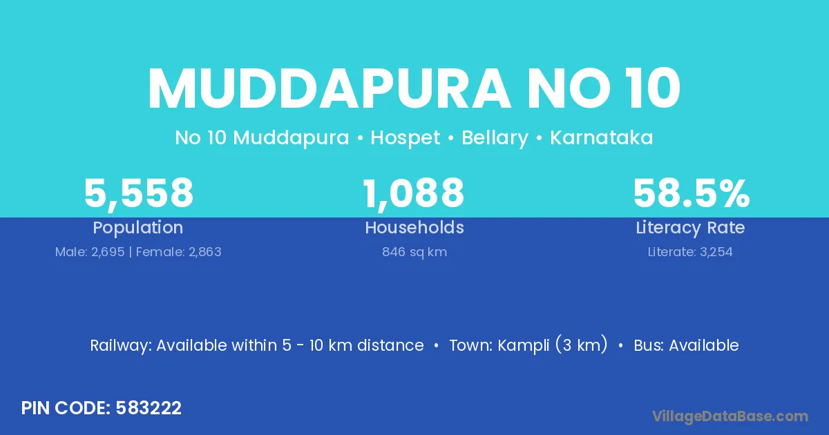 Kampli (3 km) is the nearest town to Muddapura No 10 village for major economic activities and is located approximately 3 km away.