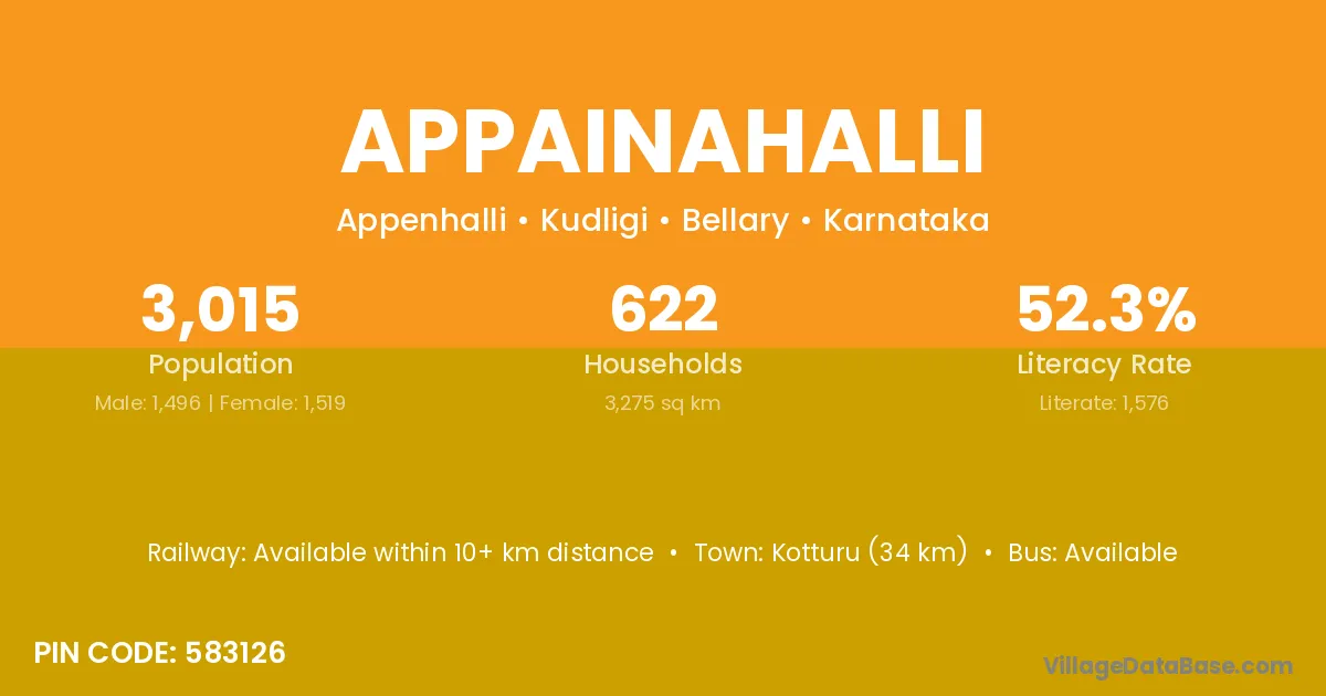 Kotturu (34 km) is the nearest town to Appainahalli village for major economic activities and is located approximately 34 km away.