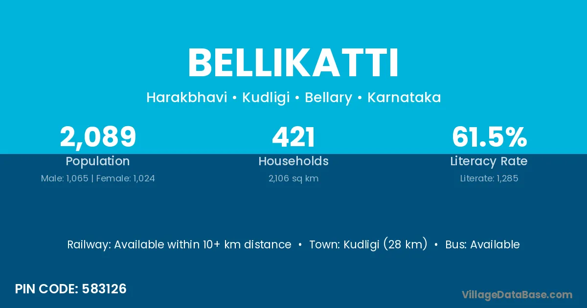 Kudligi (28 km) is the nearest town to Bellikatti village for major economic activities and is located approximately 28 km away.
