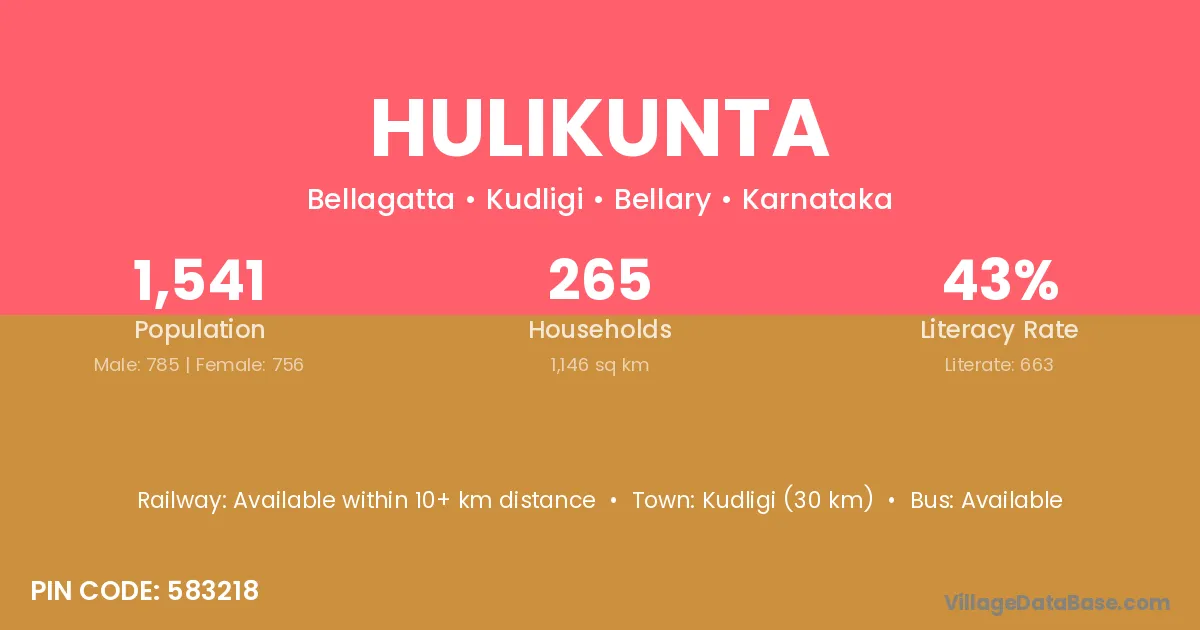 Kudligi (30 km) is the nearest town to Hulikunta village for major economic activities and is located approximately 30 km away.