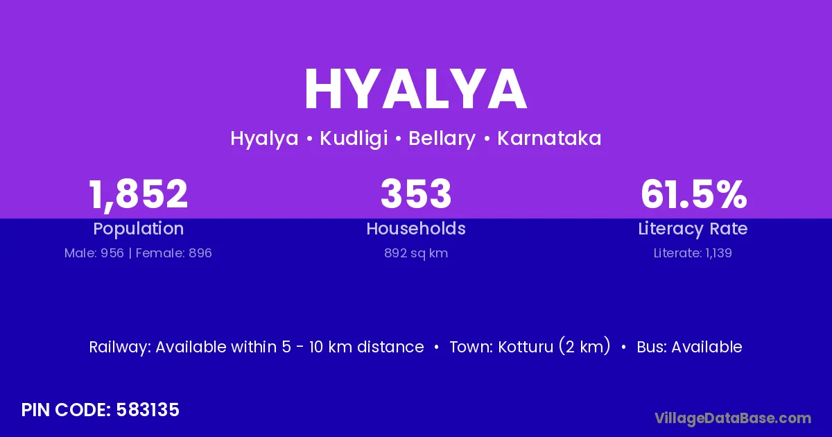 Kotturu (2 km) is the nearest town to Hyalya village for major economic activities and is located approximately 2 km away.