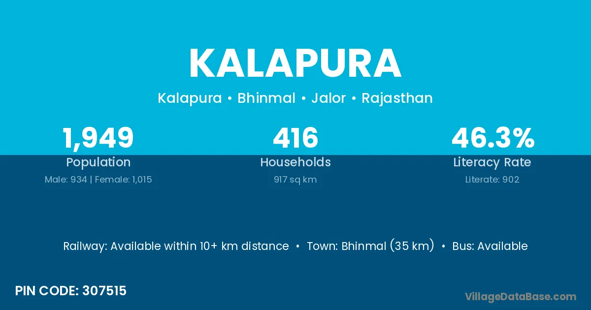 Kalapura village has a total population of 3,830 people, of which 1,995 are males and 1,835 are females.