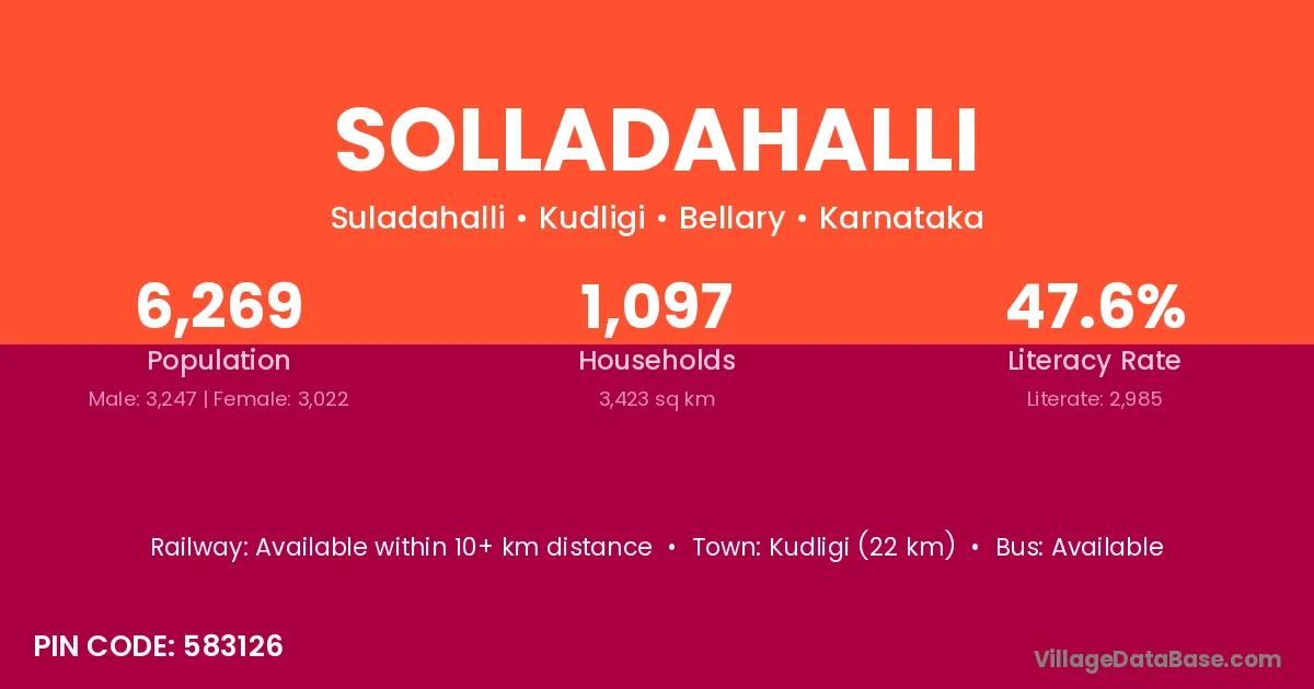 Kudligi (22 km) is the nearest town to Solladahalli village for major economic activities and is located approximately 22 km away.