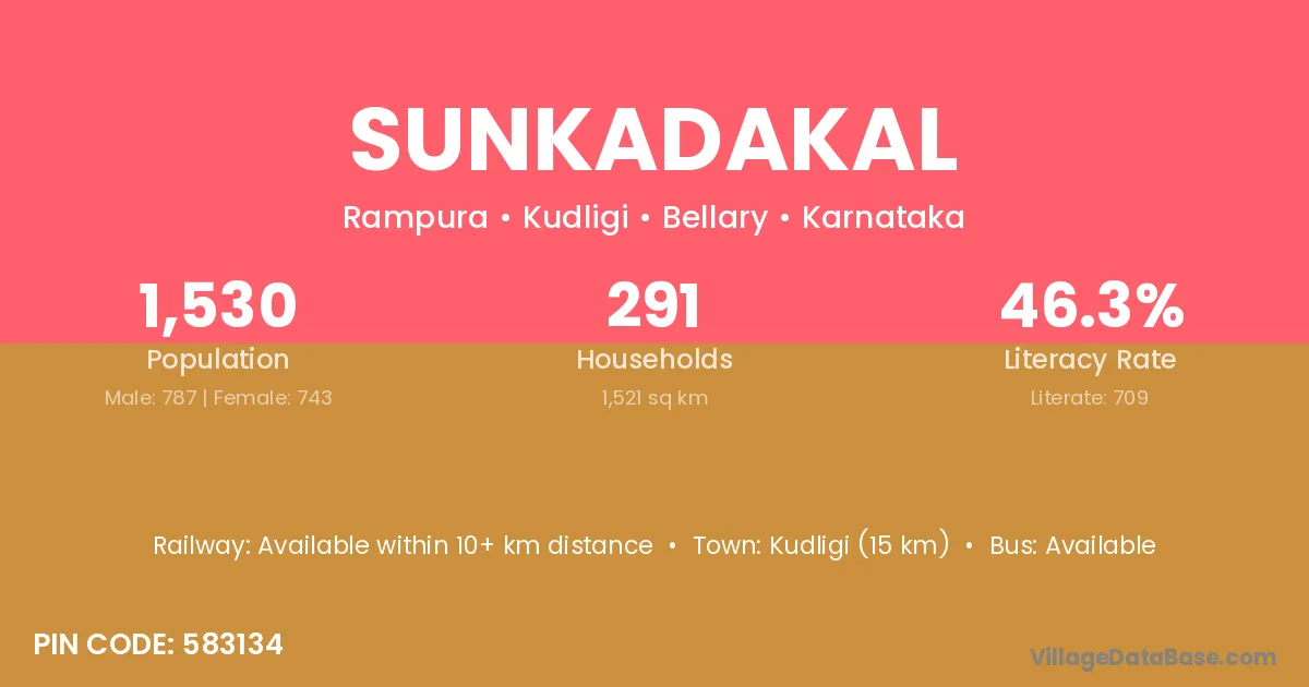Kudligi (15 km) is the nearest town to Sunkadakal village for major economic activities and is located approximately 15 km away.