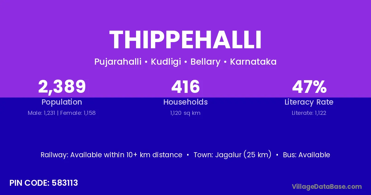 Thippehalli village has a total population of 2,389 people, of which 1,231 are males and 1,158 are females.