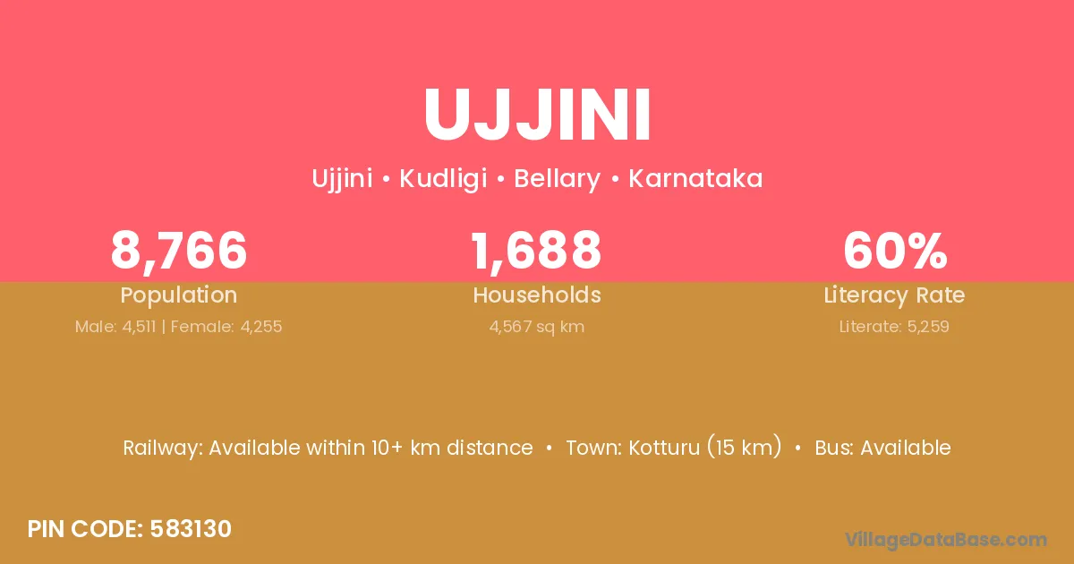 Kotturu (15 km) is the nearest town to Ujjini village for major economic activities and is located approximately 15 km away.