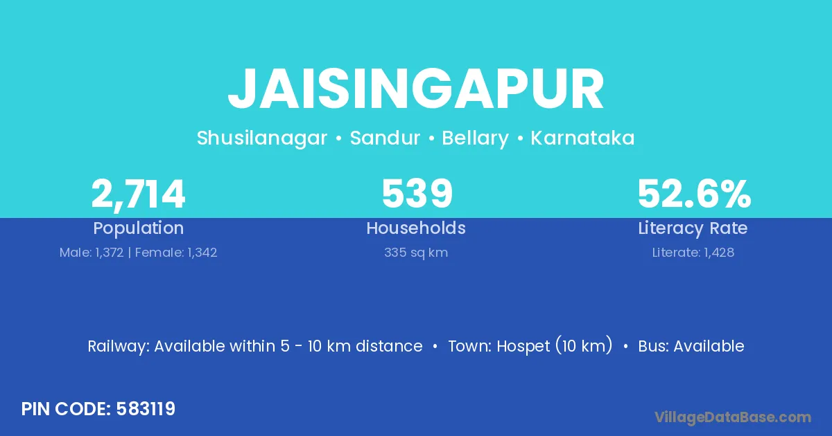 Hospet (10 km) is the nearest town to Jaisingapur village for major economic activities and is located approximately 10 km away.
