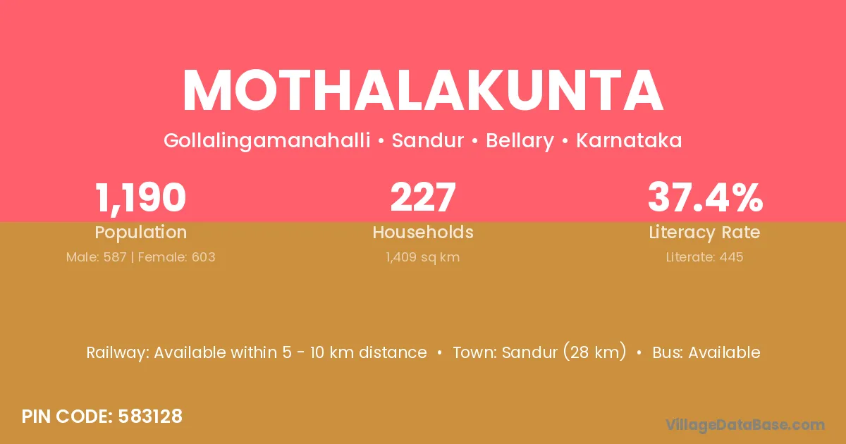 Mothalakunta village has a total population of 1,190 people, of which 587 are males and 603 are females.