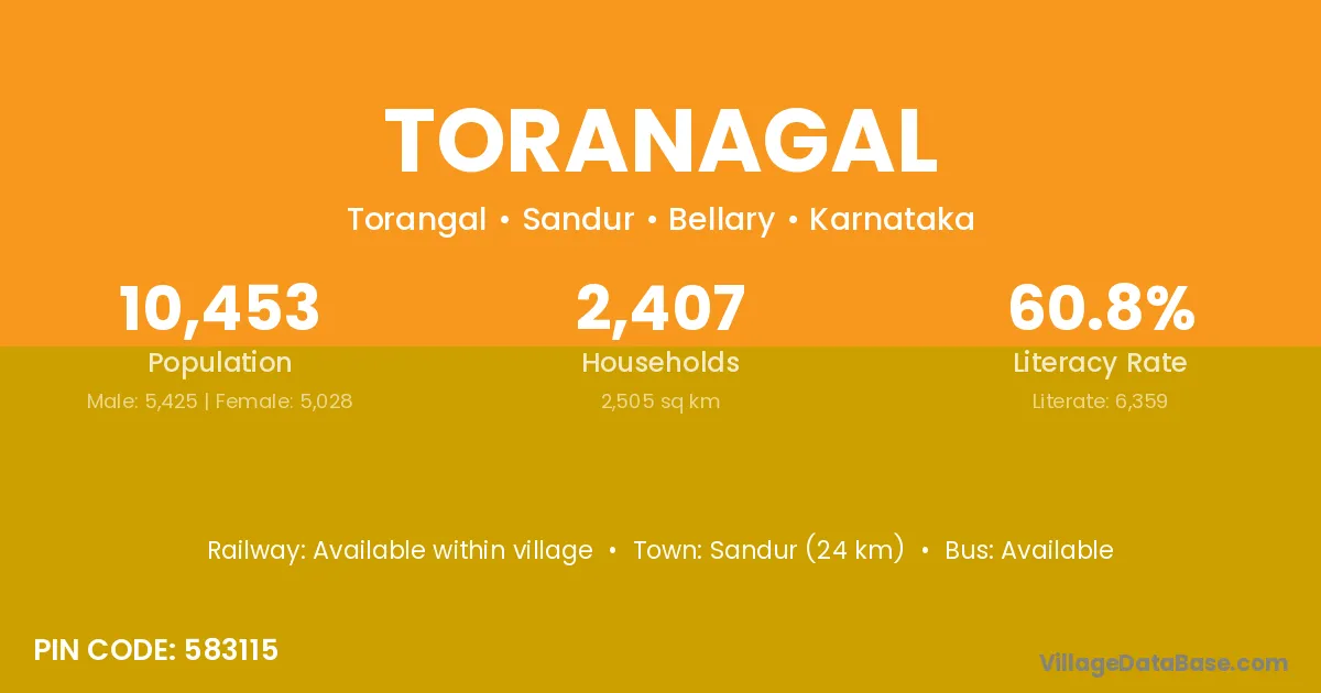 Sandur (24 km) is the nearest town to Toranagal village for major economic activities and is located approximately 24 km away.